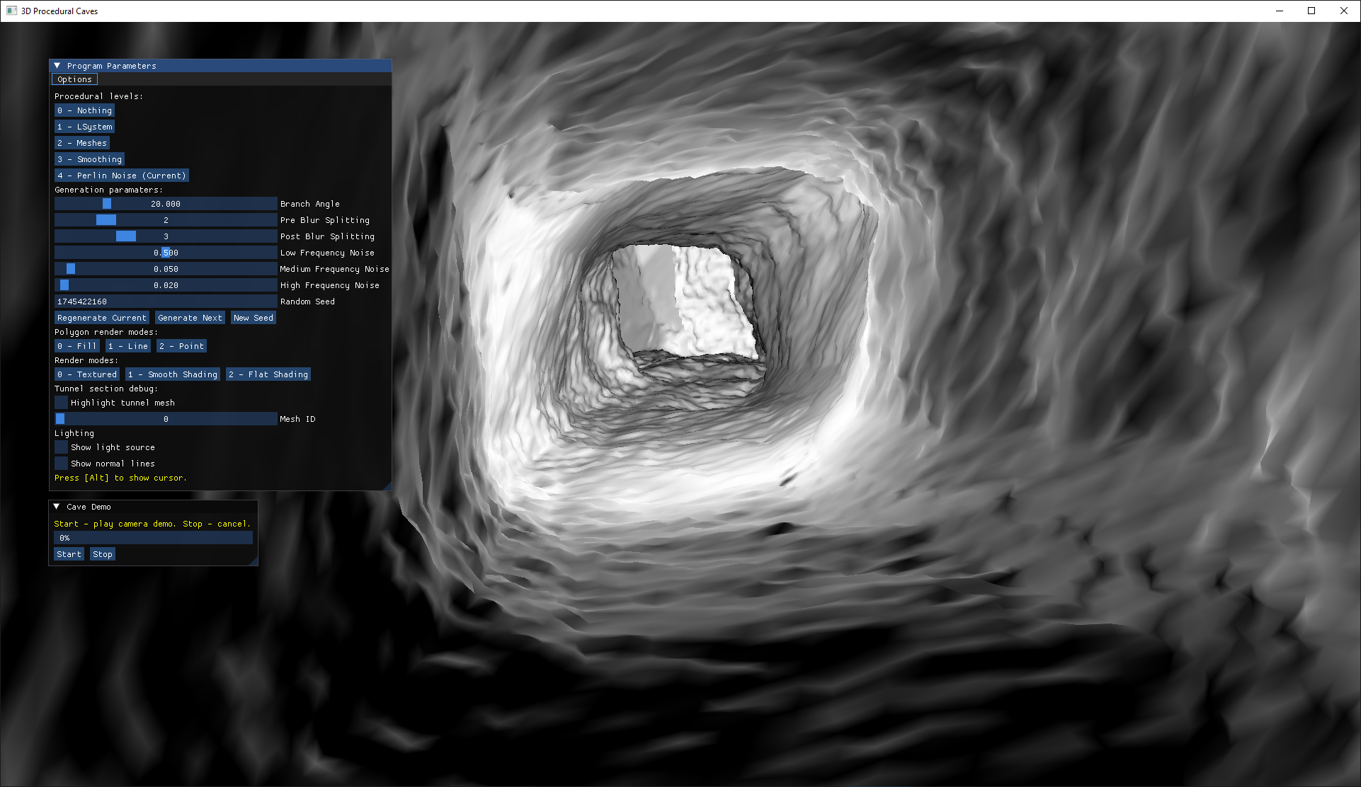 My honours project for my 3rd year of university, I made use of L-Systems and Perlin Noise for the generation, it was rendered using OpenGL and written in C++. I was enjoying playing a game related to procedural dungeon generation at the time so I choose procedural generation for my honours. I worked on it for a few months alongside researching the subject area of procedural generation (specifically cave generation). Received 2nd place in Game Technology at the Game Republic student showcase.